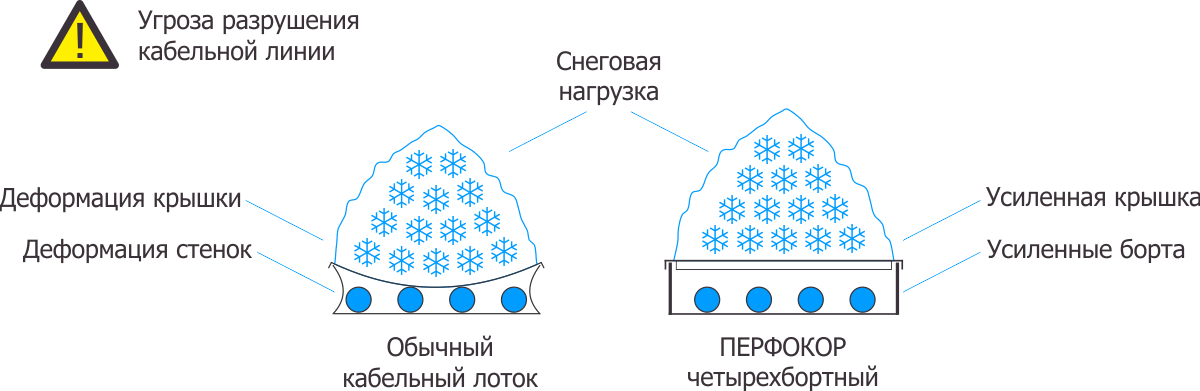 Обычные кабельные лотки, как правило, проходят типовые испытания, имитирующие нагрузку кабеля на днище лотка, и не могут, в ряде случаев, полноценно противостоять всем внешним нагрузкам и воздействиям. Поэтому при наличии снеговых нагрузок, для обычных лотков, может существовать угроза разрушения кабельной линии.